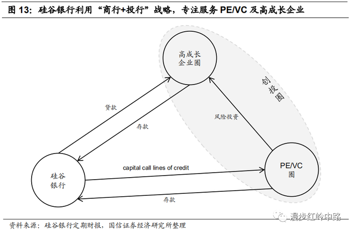 另一方面,硅谷银行金融集团扎根科技中心,与全美创业和风投圈关系紧密,为大量优质PE/VC提供贷款、直接投资、资金托管等服务。贷款业务方面,硅谷银行以PE/VC背后的投资者中长期承诺付款为担保向PE/VC提供授信(此类贷款专有名称为capital call line of credit)。除此之外,硅谷银行还向风投基金提供开户和基金托管等金融服务,并通过兄弟公司SVB Capital直接投资优秀风投基金。截至2019年,SVB Capital已投资入股约500家风投基金公司,而反过来硅谷银行为其投资的风投基金的托管规模已超过45亿美元。与创投机构之间深度的合作与绑定,也使得硅谷银行与大量优质PE/VC形成战略联盟,银行可以根据合作中获得的企业信息,来基本判断创业企业的管理团队、商业模式和发展前景是否得到认可,并进一步降低对企业融资的风险。