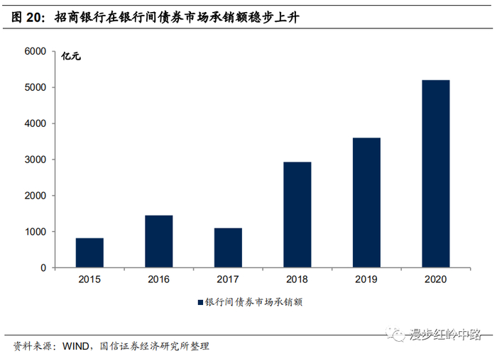 三是持续推进传统投行债券承销业务,深化业务全流程改造,为客户提供多方位融资服务。持续多年在“投贷联动”“投商行一体化”方向上的发展创新,为招商银行债券承销打下了坚实的客户基础。据WIND统计,2020年招商银行在银行间债券市场主承销债券金额为5205亿元,同比增长44.6%,排名银行类主承销商第一。