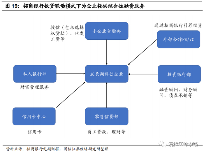 一是通过与PE/VC结合的投贷联动,为处于创业期和成长期企业提供债权和股权等综合性融资服务。早在2010年6月,招商银行已推出“千鹰展翼”计划,通过与PE、VC等机构合作,为处于创业期和成长期企业提供债权和股权等综合性融资服务。具体来看,针对一家初创公司,招商银行信贷方案由分行小企业条线发起申请,由总行小企业金融部门的专业团队负责投资决策,在提供选择权贷款的同时,还可负责PE等风险投资机构推荐,同时投行部负责提供融资顾问、财务顾问的角色,私人银行部为企业提供财富管理方面的服务等,获得利息收入、托管费、财务顾问费等多种业务收入。截至2019年末,招商银行“千鹰展翼”入库客户已达2.6万户,客户授信总额和贷款余额分别为2547亿元和419亿元。此外,为更好满足企业多层次融资和发展需求,招商银行还和各类基金合作设计投贷联动系列产品,包括投联贷、科创贷、三板贷、高新贷等,并引导基金参股子基金投资企业。