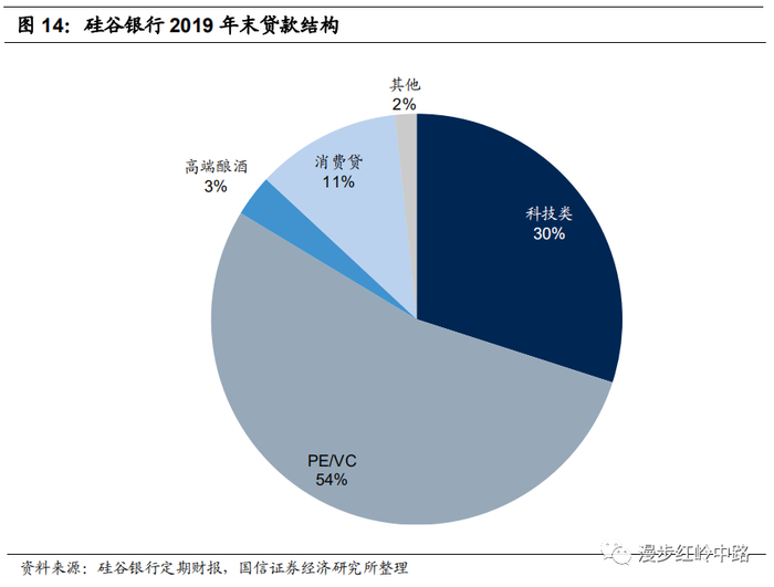 从贷款业务来看,硅谷银行目标客群主要集中在高成长企业和PE/VC等战略投资机构,贷款主要投向科技和生命科学/医疗健康贷款、PE/VC贷款、私人银行消费贷款三个方面。截至2019年,硅谷银行向PE/VC发放的贷款占全部贷款的54%,而科技类、消费贷款占全部贷款比重分别为30%和11%,其中消费贷款全都是向私人银行客户发放的贷款,主要用于购买住房、购买限制性股票,同时硅谷银行发放的消费贷款中,87%都有房地产作为抵押,信用风险得到一定覆盖。