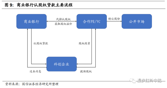 认股权贷款模式使得银行在助力企业上市的过程中,能通过合作机构代持的方式获取股权溢价,也是我国商业银行与 PE/VC的重要合作模式。认股权贷款在我国又称选择权贷款,是指银行与PE/VC合作,将债权融资与股权融资业务相结合,为企业提供的结构化融资产品。一方面,银行与PE/VC进行合作,对具有高增长潜力、但抵押质押资产不足的企业进行放贷。另一方面,PE/VC对目标企业进行股权投资,并代理银行与企业签订认股权协议。认股权协议根据内容不同可分为期权、股权、收益权三种协议,协定中银行的贷款能够按照一定的比例转换成企业股权、期权,共享目标企业股权溢价。当被投资的企业通过上市或者并购、股权转让等方式实现股权的价值增值时,代理PE/VC可以代表银行抛售或者转让所持有的认股权份额,并按照约定的协议把所获得的收益分配给银行,由此银行实现对股权溢价的分成。