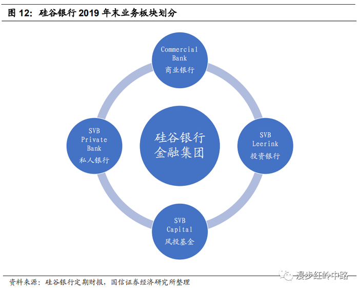从业务划分来看,硅谷银行金融集团将其业务划分为四大板块。其中,硅谷银行Commercial Bank(GCB)负责商业银行业务,SVB Private Bank负责私人银行业务,主要服务于PE/VC背后投资人和中小科创企业高管。SVB Leerink是硅谷银行金融集团在2019年新收购的业务,主要从事生命科学/医疗健康领域股权、可转债、并购、股票研究与销售交易等投资银行业务。SVB Capital为硅谷银行金融集团旗下的风投基金,可对目标企业进行股权投资。
