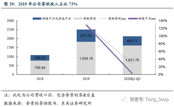 从公司收入结构来看,2019年现制茶饮收入18.2亿(yoy+130.6%),收入占比达到72.9%,烘焙及其他产品收入6.8亿(yoy+129.0%)。截至20年前3季度,奈雪三大经典茶饮霸气芝士草莓、霸气橙子、霸气芝士葡萄合计销量超1500万杯,合计贡献现制茶饮总销售额25.3%。