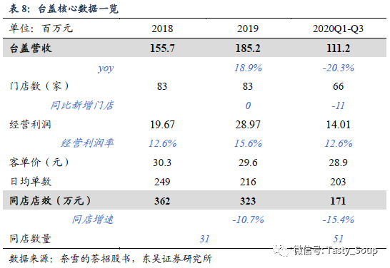 台盖疫情下战略收缩。台盖主打现制奶茶及柠檬茶,定位较奈雪的茶更加年轻化,主要聚焦学生及年轻上班群体,产品平均标价约16元。门店集中购物中心、学校等区域,面积在20~100平。2019年台盖同店店效323万(-10.7%),主要系客流减少所致。截至20年前三季度,台盖共设有门店66家,因疫情较上年同期净闭店11家。