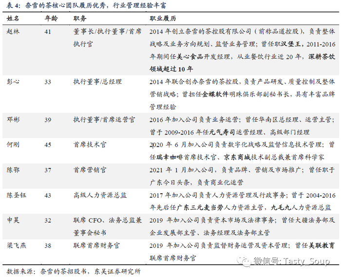 创始人深耕行业多年,高管团队专业化运营。奈雪的茶由赵林、彭心共同创立。赵林拥有近二十年餐饮行业从业经验,曾先后创办冲调式奶茶连锁店及新连锁品牌台盖奶茶。彭心曾担任金蝶明珠俱乐部副秘书长,对品牌调性、定位把握准确,且深谙客户群体喜好。夫妇携手各理一方,为公司构筑强有力的争壁垒。2020年公司引入瑞幸咖啡CTO何刚,带领公司加强数字化建设。高管团队均具有丰富的从业经验,职业履历优秀,助力奈雪品牌打造。