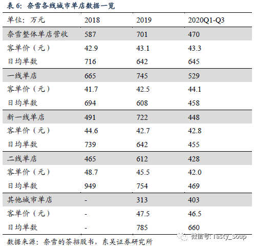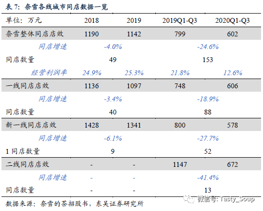 奈雪同店视角:疫情叠加快速扩店,同店下滑。2019年奈雪的茶整体同店店效约1142万元,一线及新一线同店店效分别为1097万、1341万元。新一线门店店效较高主要系门店密度低带来的客流聚集。在加速扩店背景下,2019年奈雪同店增速-4.0%,在2019年整体客单价微增0.5%背景下同店下滑主要由于新店分流所致。疫情下20年前三季度整体同店增速为-24.6%,其中一线城市复苏优于整体,同店增速-18.9%。