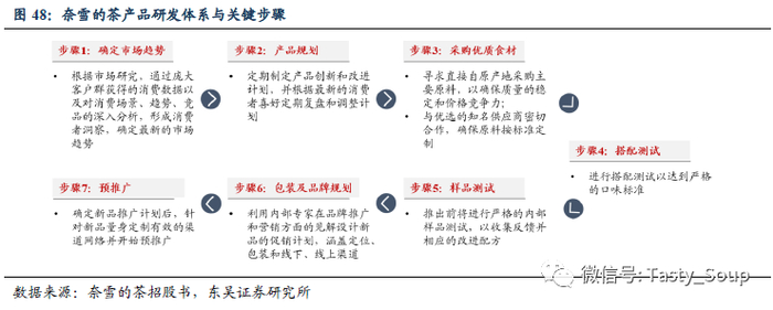 截至20年9月30日,奈雪的研发团队由在食品饮料行业具有相关工作经验的23名员工组成,并由联合创始人彭心直接领导,负责基于客户反馈不断尝试季节性其他创新食材来完善现有产品。奈雪已经形成了成熟的产品研发机制,其创新基于市场需求和数据,涉及6个关键步骤,包括确定市场趋势、产品规划、采购优质食材、搭配测试、样品测试、包装及品牌规划和预推广。结合大数据分析后了解消费者画像,将更加精准把握个性化消费者需求,通过高效产研能力推出更多热门产品。