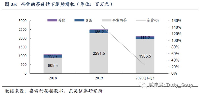 主力品牌奈雪营收超9成,疫情下逆势增收。目前公司旗下共运营奈雪的茶(含奈雪的茶及奈雪PRO)和台盖两大品牌。2019年公司营业收入达到25亿元,其中奈雪的茶营收22.9亿元(yoy+152%),收入占比为91.6%;台盖营收为1.85亿(yoy+18.9%),成长稳健。得益于疫情下良好的消费者黏性,奈雪的茶20年前三季度逆势增收,营收达19.9亿(yoy+24.7%)。