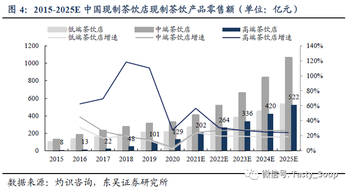 消费升级+需求升级,门店高端化势不可挡。高端新式茶饮门店专注于使用优质、新鲜配料生产现制茶饮,创造良好的差异化的茶饮体验。近年来,随着我国人均可支配收入提高,尤其是一线及新一线城市消费群体购买力的上升,叠加消费者对新式茶饮体验的需求不断增长,高端新式茶饮门店快速兴起。据灼识咨询预计,高端店内现制茶饮零售额在2020年达到129亿元(15-20年CAGR达75.8%,且2020年受疫情影响增速放缓),并有望在2025达到522亿元(20-25年CAGR为20.0%)