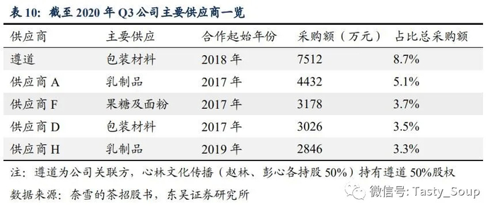 截至20年9月30日,奈雪已经与超过300家知名的原材料供应商达成合作,其中与前十大供应商的合作关系平均在2年以上。2018-2020年前三季度奈雪前五大供应商合计采购额分别为1.27/ 2.24/ 2.10亿元,占总采购额比分别达到28.0%/ 23.8%/ 24.2%。