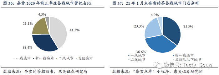 奈雪集中布局高线城市,合计门店突破500家。截至2020年前三季度,奈雪的茶共有422家门店(较上年同期新增147家,yoy+53.4%),其中一线、新一线及二线城市门店营收占比分别达到41.3%、33.4%、21.1%。根据2021年1月末“奈雪点单”小程序显示,奈雪中国大陆门店已达511家。一线城市共180家,占总门店数35.2%。其中奈雪创始地深圳达到96家,北上广分别为23、33、28家。新一线城市共计187家,占总门店数36.59%。奈雪于二线城市迅速扩张,共计119家(较18年底新增109家),占总门店数23.29%,超过95%的门店都位于一二线城市。