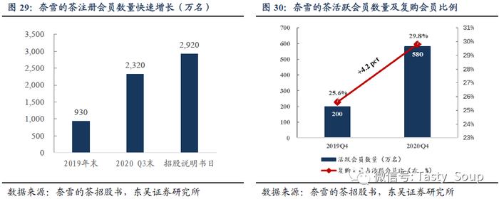 一经推出,奈雪的会员数量增长迅速,从2019年末的930万名大幅增加至2020Q3末的2,320万名。而截至招股说明书日,奈雪注册会员已达到约2,920万名。其中,活跃会员人数也从19Q4点200万名增加至20Q4点580万名;20Q4有29.8%的活跃用户为复购用户,高于行业平均,并较19Q4提升4.2pct。而在2020年前三季度中,共有49.4%的订单来自于会员;而2018-2020年前三季度分别有4.4%/ 12.5%和 23.9%的消费者通过奈雪或第三方平台实现线上的外卖订单。