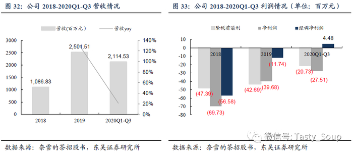 深耕高端现制茶饮市场,覆盖全国61个城市。奈雪定位高端现制茶饮连锁店,旗下现有旗舰品牌奈雪的茶和子品牌台盖。奈雪于2015年11月在深圳开出首家门店,经过两年的探索,于2017年11月进军全国,开启品牌扩张期。至2018年9月,公司已在中国拥有超100家奈雪门店。2019年起,奈雪开始尝试多种店铺形态,现后开设奈雪梦工厂概念店奈雪PRO茶饮店,加强数字化运营,提升门店效率。目前,奈雪已覆盖中国大陆61个城市,拥有超500家门店,并进驻香港特区、日本等地。截至2020年前三季度,公司营收达到21.1亿(+21%);伴随规模效应与盈利能力提升,公司逐步减亏,剔除股权激励等一次性费用后,公司实现经调净利润448万元,经调净利率0.2%。