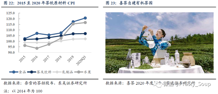 喜茶深入供应链的上游。喜茶坚持只用原叶茶制作茶饮,而为了保障出品稳定性,公司2017年在贵州梵净山自建500亩有机茶园,特邀农业大学与专业研究机构参与选种和培育,并在三年后的2020年5月取得有机产品认证证书。另外,2020年喜茶开始自研草莓品种,有望于2021年上市。