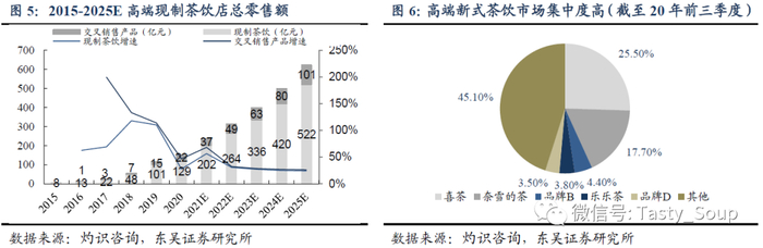 据灼识咨询预计,我国新式茶饮市场2020年市场规模达1,136亿元,伴随产品创新、消费接受度提升与线上业务发展,该市场将加速扩容,有望2025年达到3,400亿元(2020-2025年CAGR达24.5%),成为茶行业规模最大细分赛道。2020年我国新式茶饮市场总销售额约60%来自现制茶饮门店(门店分为高端及中低端,20年整体零售额约666亿),其中高端现制茶饮门店多以直营为主,专注于使用优质、新鲜配料生产现制茶饮,创造差异化茶饮体验。受益于消费升级+需求升级,高端门店快速扩张,店内现制茶饮零售额于2020年达到129亿元(15-20年CAGR高达75.8%),并有望在2025年达到522亿元(20-25年CAGR为20.0%)。截至20年前三季度,全国高端新式茶饮市场规模CR5达55%,集中度高;其中喜茶市占率25.5%,奈雪的茶市占率17.7%,分列行业前两名。