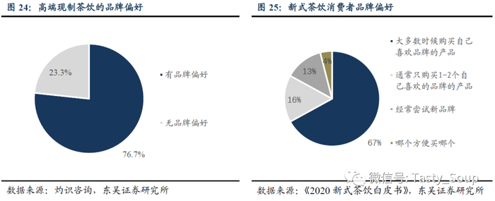 新式茶饮已进入品牌化发展阶段。随着头部品牌的扩张快速,新式茶饮市场的规模效应日益显著,集中化趋势愈发明显。而茶饮的高端化从其产品口味、天然原料、质量延伸至品牌形象所蕴含的茶文化,也更容易建立起良好的品牌形象和更忠诚的客户群体。根据灼识咨询的调查,76.7%的受访者在选择高端现制茶饮时表现出强烈的品牌偏好。而《2020新式茶饮白皮书》的调查也显示,有明确的品牌偏好和一定的品牌忠诚度的现制茶饮消费者占比约83%,相对于2019年的74%进一步提高。