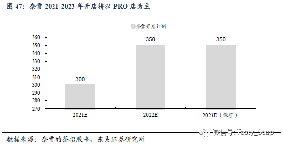 伴随需求增长红利,未来奈雪将继续在当前渗透率较低且客流量较大地区,如高级写字楼及居民区的核心位置增设茶饮门店。2021-2022年期间,奈雪计划主要在一线及新一线城市分别开设300、350间门店。公司计划约70%新店为奈雪PRO店,并保守预计2023年开店计划将至少与2022年持平。
