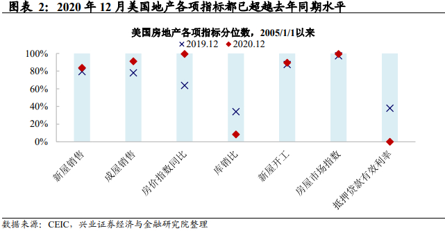高销售、高开工、高房价和低库存。疫情对地产的冲击主要集中在2020年3至5月,之后地产销量快速修复疫情造成的缺口。从2020年12月的地产数据来看,新屋成屋销售、新屋开工、房屋市场指数等指标都已经超越2019年同期水平,且都处于2005年以来80%以上的高分位数水平。