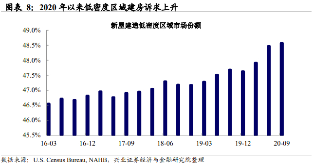 行为变化二:远程办公带来更大、更偏远住房的需求。疫情发生后,越来越多的家庭出于规避疫情、需要更大的房子满足家庭成员的远程工作。若同时考虑价格等综合因素,则更多家庭选择在较为偏远的、人口密度低的区域居住。从数据来看,建造商也更多将新屋建造在低密度地区,低密度区域的市场分额从2019年的47.6%上升至2020年的48.6%,并仍有持续上升的趋势。