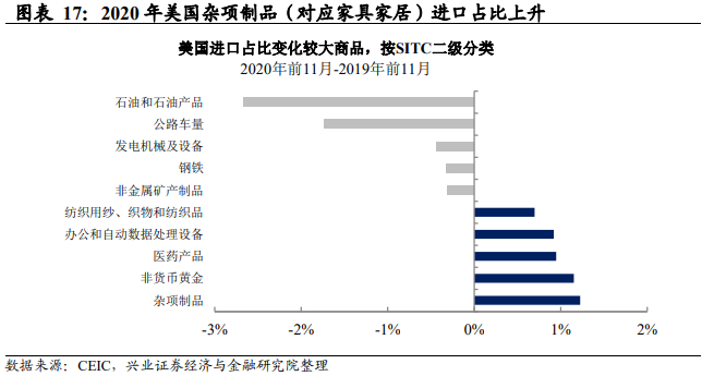 中国大概率会受益于房地产后周期产业链。建筑材料方面中国虽然受益不明显,但地产竣工后的装潢也是房地产的重要部分,中国出口可能极大程度上受益于美国地产后周期的繁荣。拆分美国2020年出口商品的构成,我们发现,杂项制品进口的占比明显上升,其中家具和家居用品贡献度最高。