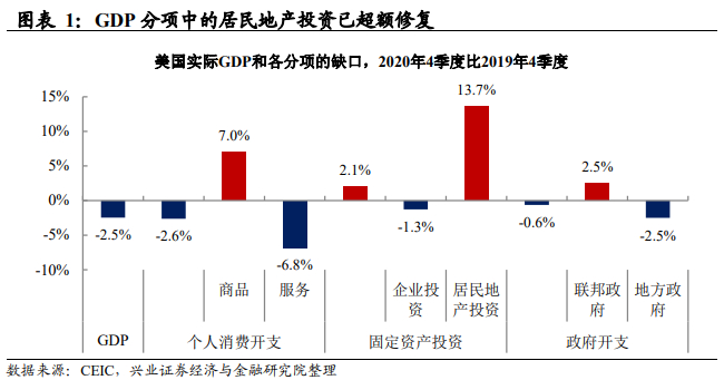 美国居民地产投资已大幅超过疫情前水平,是支撑经济回升最大支柱。2020年4季度,美国GDP较去年同期仍有2.5%的缺口,但居民地产投资已大幅超过疫情前的水平(2019年四季度),较疫情前的水平增长13.7%,为美国经济恢复提供了最大的贡献。