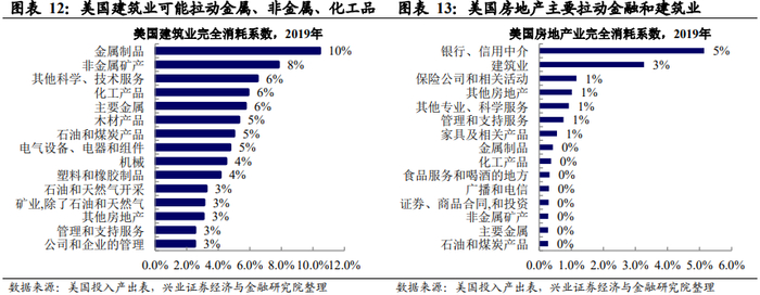 美国房地产对金属制品、非金属矿产有较大的拉动作用。从2019年美国投入产出表来看,建筑业的完全消耗系数为0.98、直接消耗系数0.47,主要拉动金属制品、非金属矿物、化工产品等行业;而房地产行业内的增加值率较高,对其他行业的拉动较低,主要集中在金融业和建筑业。