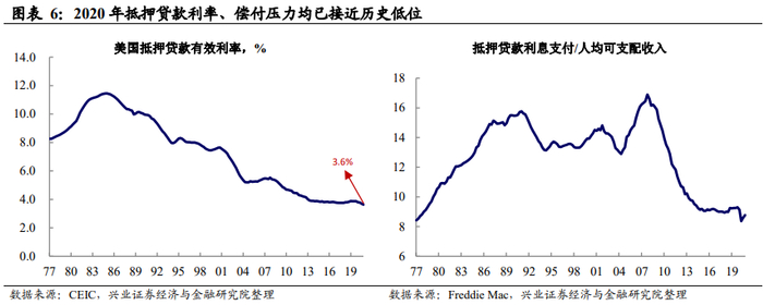 而且,在上文也提到,尽管疫情对经济产生较大的冲击,但是由于极低的利率环境,抵押贷款利率支付与人均可支配收入的比值在一个历史低点。
