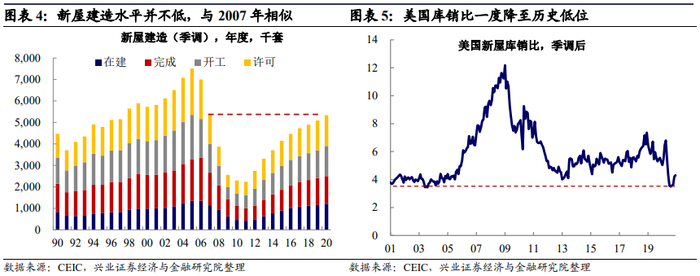 从建造来看,已卖未开工的存量仍能支撑开工的持续性。从2020年新屋销售房屋的构成来看,由于在建和未开工房屋的占比较大,已销售出的未完成建造的房屋也将在2021年继续建造。除此之外,从NAHB针对地产开发商的调查指数来看,地产开发商对未来六个月的繁荣预期持续上升,而该指数从趋势来看与新屋开工的走势一致,预示着短期建造活动仍然活跃。