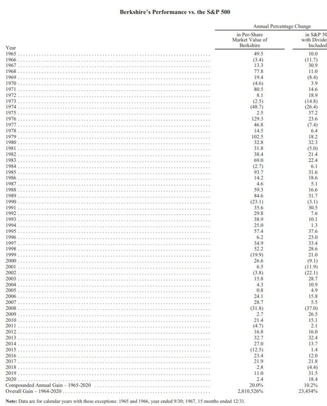 依照惯例,第一页是伯克希尔业绩与标普500指数表现的对比,2020年,伯克希尔股价年度涨幅2.4%,而同期内,标普500指数计入股息再投资的整体回报率为18.4%。长期而言,1965年至2020年间,伯克希尔股价复合年均增长率为20%,大幅超过标普500指数10.2%的复合年均回报率;1964年至2019年间,伯克希尔股价累积增长率更达到惊人的2,810,526%,远高于标普500指数23,454%的累积回报率。