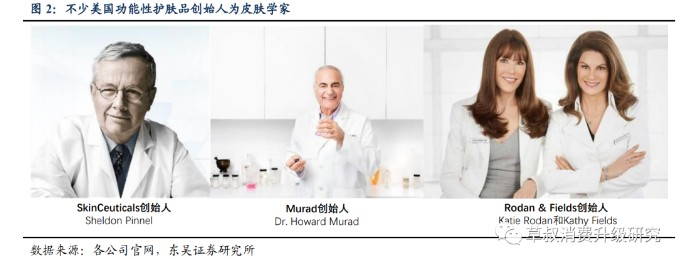 不少美系功能性护肤品的创始人有过硬的相关研究背景。许多创始人在此之前的职业是药剂师或皮肤科医师,例如SkinCeuticals创始人Sheldon Pinnel是美国杜克大学皮肤科教授,其奠定了左旋维C有效成分的地位;MURAD是由美国皮肤科学会院士、皮肤护理专家Murad慕拉博士于1989年创立的护肤品牌,产品结合50000+例皮肤病患者治疗经验与身为皮肤病协会院士所拥有的丰富理论基础;Rodan & Fields创始人Katie Rodan博士和Kathy博士都是治疗痤疮的皮肤科医生,在2008年联合创立Rodan & Fields。