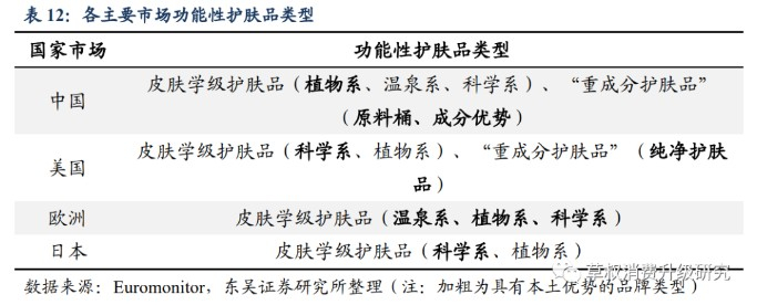 受资源禀赋、消费习惯、消费结构等因素影响,各国功能性护肤品存在不同类型。