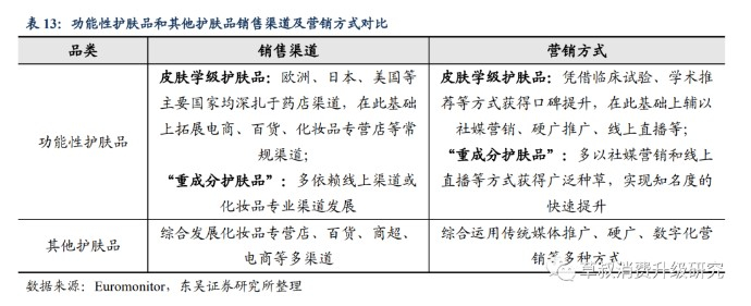 营销角度:皮肤学级护肤品重口碑营销,“重成分”依赖新媒体营销。皮肤学级护肤品的专业性和销售渠道决定其更加重视口碑营销,国内外知名的皮肤学级护肤品牌往往在产品研发阶段便与皮肤学专家建立紧密合作,合作产品的临床试验,并在产品推出后通过专家进行学术背书及药店销售引流,由此为品牌积累良好的口碑和粘性较高的消费群体。在此基础之上,皮肤学级护肤品牌再通过硬广推广、社媒营销、线上直播等方式提升品牌知名度。若无“医研共创”和口碑营销的积累,皮肤学级护肤品牌很难真正赢得消费者的信赖。对于“重成分”品牌来说,其营销思路亦与其线上销售渠道相符,一般较为重视社交媒体种草、线上直播等新媒体营销方式。