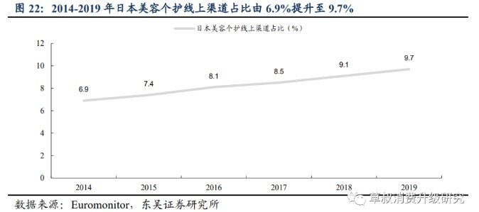 年轻群体更习惯网购,促使日本美容个护电商渠道占比不断提升。日本化妆品线上购物渠道主要为亚马逊、乐天和部分品牌自营电商平台,但由于物流成本较高,线下门店普及导致线上需求低等因素,日本化妆品电商渠道占比相对较低。随着消费主力人群向习惯网购的年轻群体转移,化妆品厂商、渠道商等开始积极布局线上,例如资生堂2017年上市了以线上销售为中心的品牌“Recipist”,并计划2020年之前投入270亿日元加强与大型电商企业的合作。运营日本最大美容综合网站“@cosme”的日本istyle公司在2018年12月3日仿效中国的“双11”举办了为期1天的促销活动,实现交易额3亿日元,占比全年交易额约10%,助力网购热度升温。2014-2019年,日本美容个护的线上渠道占比由6.9%提升至9.7%,占比提升2.8pct。