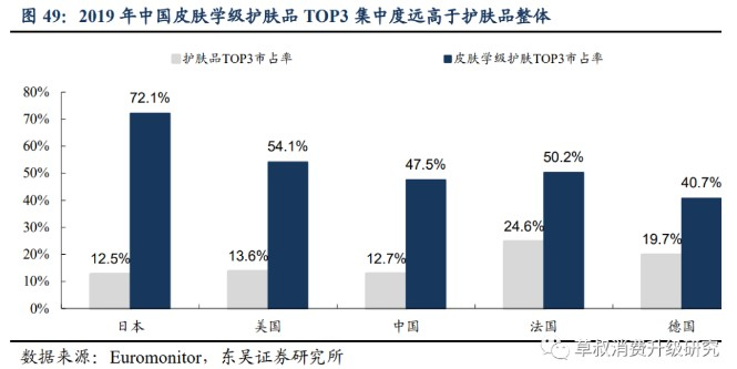 皮肤学级护肤品龙头份额较为集中,头部市占率一般在15%-30%之间,远高于护肤品整体。对比各主要国家,皮肤学级护肤品TOP1品牌在本品类的市占率一般为15%-30%,远高于护肤品TOP1品牌的市占率(一般在4%-10%)。从中国情况看,尽管薇诺娜在护肤品的市占率仅为1.1%,但其在皮肤学级护肤品类市占率高达20.5%,远高于护肤品整体TOP1品牌百雀羚的市占率(2019年为4.5%)。皮肤学级护肤品头部在品类市占率更高,主要系皮肤学级护肤品往往依托于多年的临床试验及学术推广,使得其产品壁垒更为深厚。