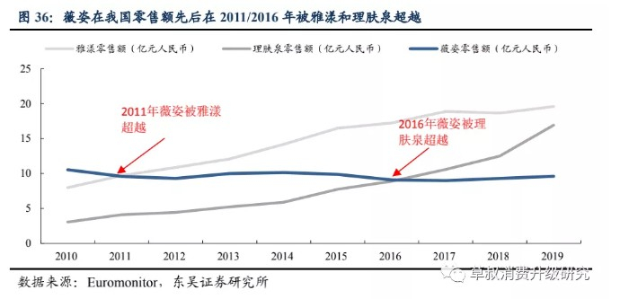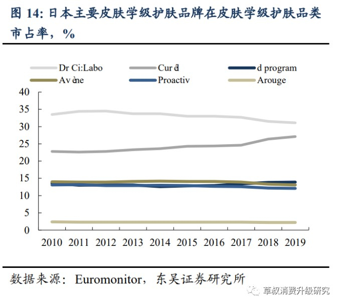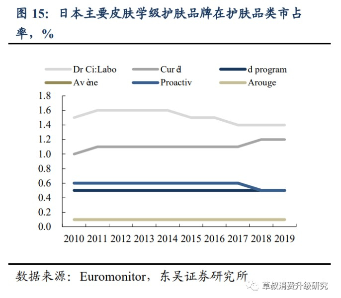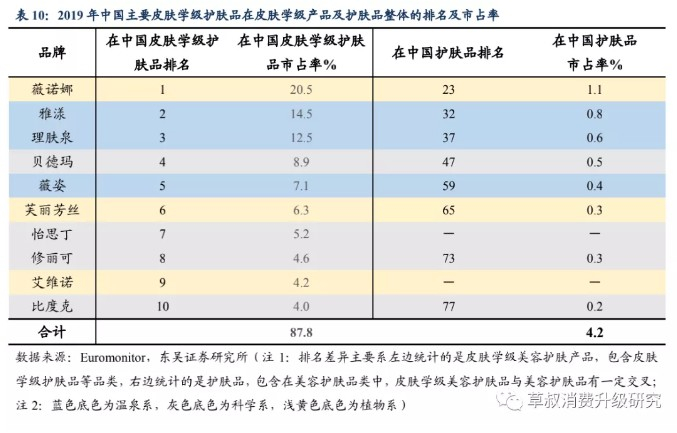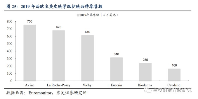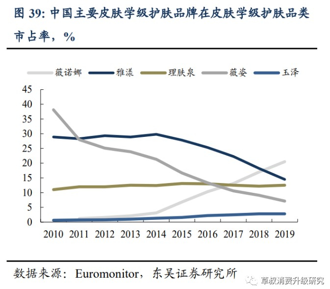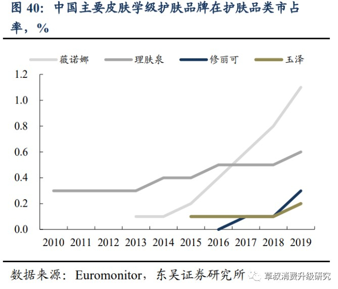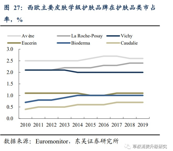 西欧主要皮肤学级产品前三位均为温泉系且零售额均在6亿元以上,皮肤学级护肤品牌在护肤品市占率稳中略升。根据Euromonitor数据,西欧皮肤学级产品前三位分别为雅漾、理肤泉和薇姿,均为温泉系代表品牌,2019年在西欧地区零售额分别为7.5/6.8/6.1亿元。在皮肤学产品前十名中,从品类上看,共有3个温泉系品牌、4个植物系品牌和3个科学系品牌;从国别上看,共有7个法国品牌,3个德国品牌,法国和德国在功能性产品发展上领先于西欧其他地区。另外,2010-2019年皮肤学级护肤品牌在护肤品整体市占率总体稳中略升,其中理肤泉、贝德玛、欧缇丽提升相对较快。
