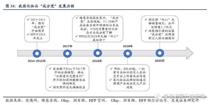 理性主义崛起,我国“成分党”品牌不断涌现,未来方向为补齐发展短板。我国“重成分”品牌的主要表现形式为“成分党品牌”。我国“成分党”开始形成于2014-2015年,在之后的几年中,Olay等传统护肤品牌借助宣传某一成分打造爆品大获成功,同时丰富的社交平台方便品牌进行消费者教育,不少年轻消费者对化妆品选购趋于理性。逐渐地,有越来越多品牌加入到产品成分的教育中,品牌也流行以成分来定义产品功效。国内“原料桶”代表品牌Home Facial Pro正是成立于2014年,并于2016年推出首款产品。凭借出色的内容营销,仅用两年时间,2018年品牌即进入天猫美妆销售前十名、全年销售规模破十亿。国内“成分优势”类型品牌的发展系“成分党”发展的又一阶段,其实质为原料商品牌化,代表品牌为华熙生物旗下的润百颜、夸迪等。
