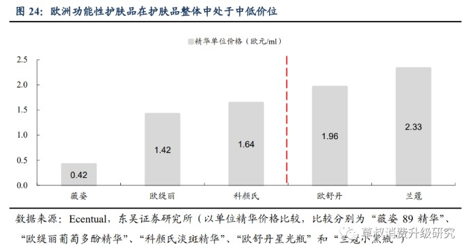 欧洲功能性护肤品价格较为亲民,主要为中低价位。以各品牌精华品类的单位价格为例进行比较,功能性护肤品牌科颜氏、欧缇丽、薇姿等每毫升价格均低于中高档品牌兰蔻和欧舒丹,总体价位较为亲民,利于获得更广阔的消费群体。