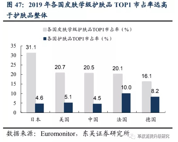 皮肤学级护肤品TOP3集中度大多在40%-55%,远高于护肤品10%-20%的集中度。根据Euromonitor数据,2019年各主要国家皮肤学级护肤品TOP3集中度范围为40%-75%,尤其集中于40%-55%。同时,2019年各主要国家护肤品TOP3集中度仅为10%-20%。由此可再次印证,皮肤学级护肤品赛道具有高集中度的特点。