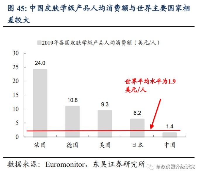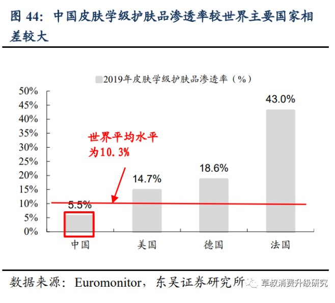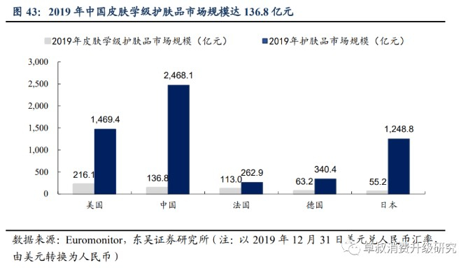对比国外主要市场发现,皮肤学级护肤品均为护肤中重要组成,我国人均消费额及在护肤品渗透率与世界主要国家相差较大,发展空间广阔。对比世界主要护肤品市场发现,皮肤学级护肤品均为其重要组成,在护肤品的占比主要位于15%-40%之间。而2019年我国皮肤学级护肤品在护肤品的渗透率仅为5.5%,甚至低于世界平均水平10.3%。另外,根据Euromonitor统计,2019年中国皮肤学级护肤品市场规模达136.8亿元,从整体规模上仅次于美国,然而从人均消费额看仅为1.4美元,较欧美、日本有四到十几倍的差距,也低于世界平均水平。综合在护肤品偏低的渗透率及较低的人均消费额即可得出,我国皮肤学级护肤品需求提升空间仍十分广阔。