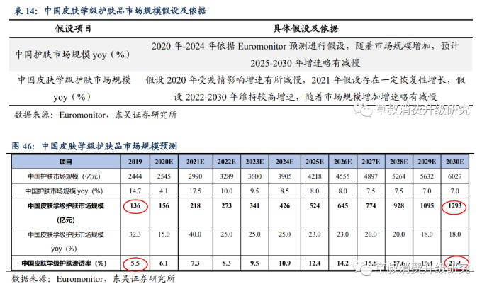 预计到2030年我国皮肤学级护肤市场规模接近1300亿元,在护肤品渗透率超20%。我们假设受疫情影响,2020 年中国护肤市场和皮肤学级护肤市场增速均有所放慢,但在2021 年有一定恢复性增长,2022 年起保持较快增速,但随着规模增加增速有所递减。则根据图 46 具体假设条件,我们预计至 2030 年中国护肤品整体规模为 6000 亿元以上,皮肤学级护肤市场规模为 1200-1300 亿元,皮肤学级在护肤品渗透率超 20%。(即根据预计,2019-2030 年中国护肤品市场规模增速 CAGR 为 8.6%,中国皮肤学级护肤市场规模增速 CAGR 为 22.8%)