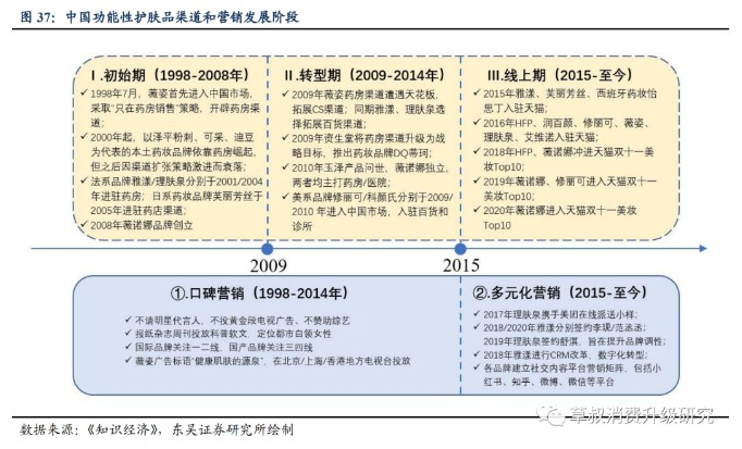 中国功能性护肤品营销方式发展历经两个时期:口碑营销期—多元化营销期。