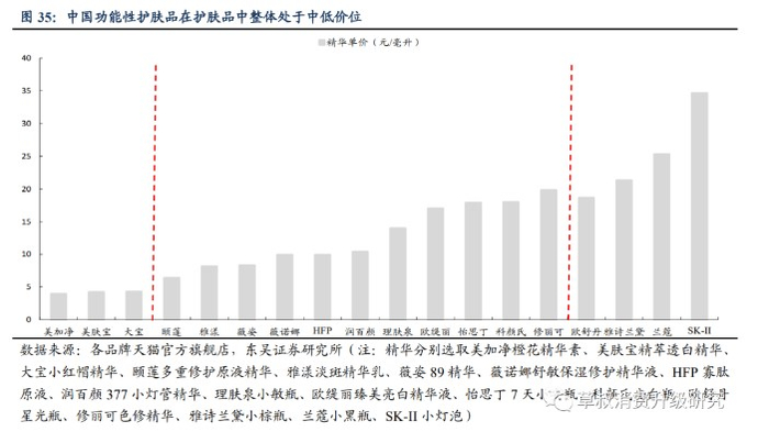 中国功能性护肤品整体处于中档价位,利于推广大众群体,推动渗透率提升。从各品牌的精华液单价对比来看,功能性护肤品品牌每毫升单价相较于雅诗兰黛、兰蔻、SK-II等综合护肤品牌有一定差距,总体处于中档价位,利于打开大众市场,提升功能性护肤品在国内渗透率。