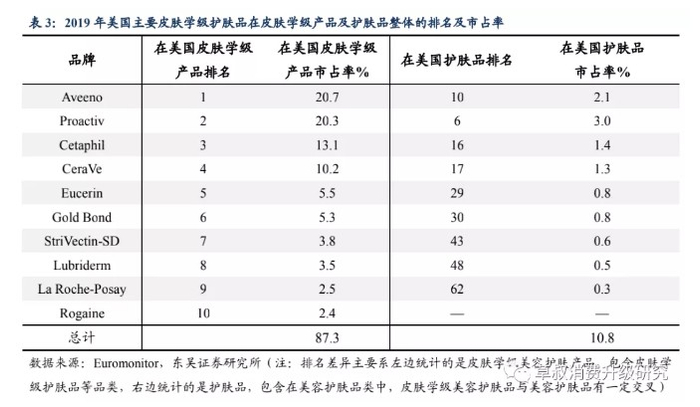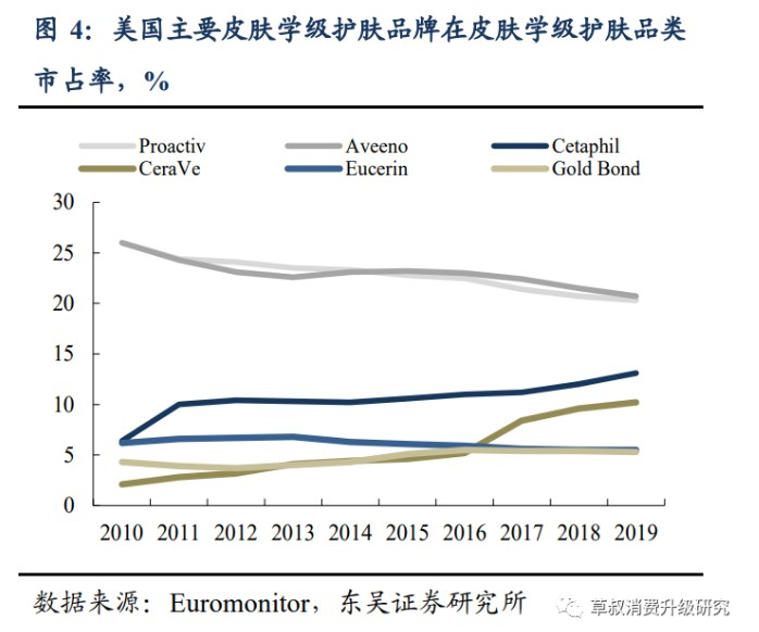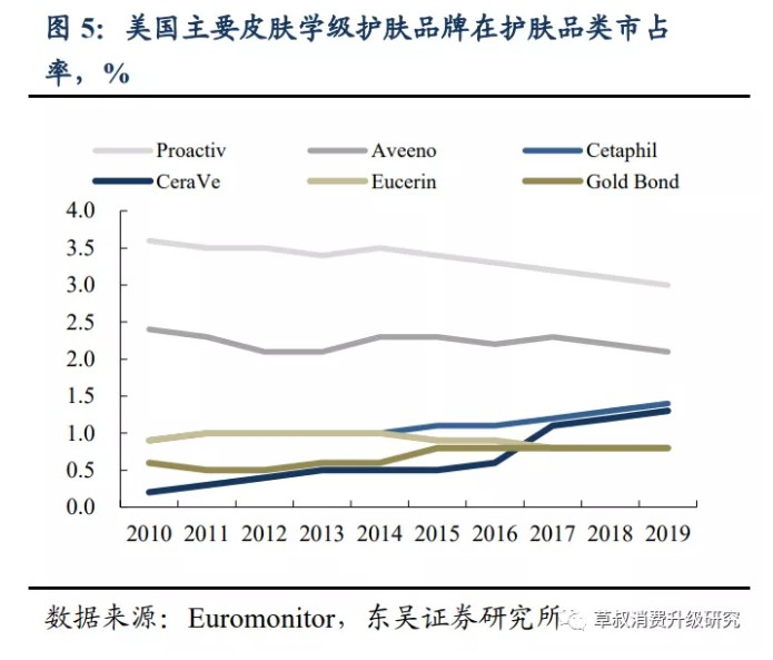 美国主要皮肤学级产品份额较为集中,领先品牌零售额在6亿美元以上,在护肤品中皮肤学级护肤品市占率稳步提升、纯净护肤份额亦快速增加。根据Euromonitor数据,美国皮肤学级产品份额较为集中,2019年前十大集中度达84.8%,其中排名前两位的Aveeno和Proactive零售额均在6亿美元以上。在护肤品各细分领域中,Cetaphil、CeraVe、Gold Bond等主要皮肤学级护肤品品牌份额稳步提升,纯净护肤品例如Drunk Elephant和Burt’s Bees份额亦快速增加。在2019年美国护肤品前十位中,共有3个功能性护肤品,其中有2个皮肤学级护肤品,1个纯净护肤品(Burt’s Bees)。