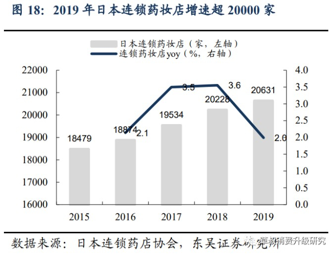 在日本药妆店店铺较为密集且覆盖广,发展较为成熟。日本连锁药妆店总数从2015年的1.85万家增长到2019年的2.06万家,平均每年新开店数达 500多家。2019年日本药妆店总销售额高达4804亿元。比较知名的大型连锁药妆店WELCIA、鹤羽、松本清、COSMOS等,店铺数均过千家。