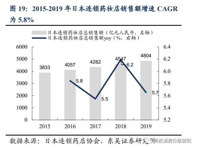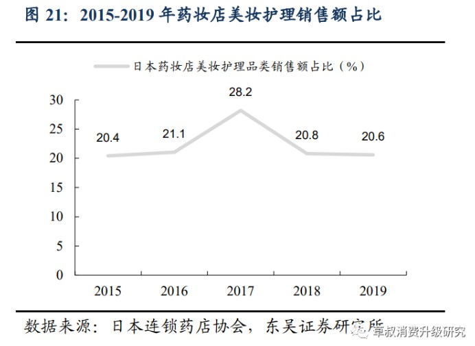 药妆店售卖商品主要包括药品、美妆护理品、食品、日用杂货等,美妆护理品品类销售占比在20%-30%。日本药妆店实施混业经营,经营品类包括药品、美妆护理品、食品、日用杂货等,其中药品销售占比约六成。2017-2019年连锁药妆店美妆护理品类销售额均在900亿元之上,美妆护理品类的销售占比在20%-30%之间。