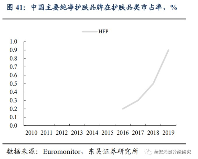 功能性护肤品是国牌崛起的最重要的路径之一。我国消费者更崇尚天然成分皮肤学级护肤产品和“成分党”的功能性护肤品。20世纪末以来,我国的皮肤学级护肤品品牌经历了由仅依靠药店渠道、口碑营销,到药店和线上渠道共同发展、以口碑营销为核心的多元化营销阶段。从竞争格局看,国牌崛起成为核心特点,国货皮肤学级护肤品牌薇诺娜2017年以来超越薇姿、理肤泉、雅漾,目前以20.5%市占率位列皮肤学级护肤首位,功能性护肤品牌薇诺娜和HFP均位列护肤品份额TOP30。