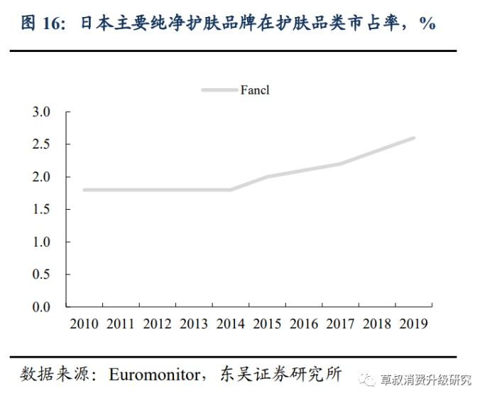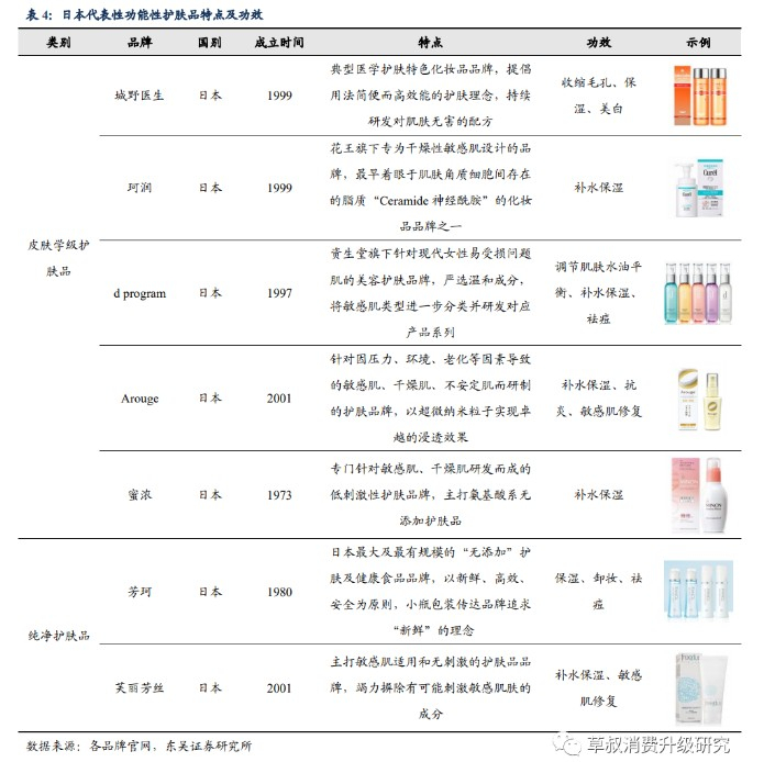 日本功能性护肤品包括皮肤学级护肤品和纯净护肤品,总体较为温和,功效主要为补水保湿和敏感肌修护。日本国内皮肤学级护肤品和纯净护肤品均发展较为顺利,皮肤学级护肤品牌包括城野医生、珂润、d program等,其中不少为专门针对敏感肌人群的品牌,从功效上看由于日本消费者更追求水光感肌肤,所以注重补水保湿且更为温和。纯净护肤品包括芳珂和芙丽芳丝等,例如芳珂是日本最大及最有规模的“无添加”护肤品牌,不含日本政府列出的102种对皮肤构成敏感的防腐剂及有损肌肤的添加剂,为保证产品品质不大量生产及大量储货。