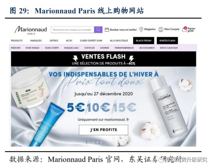 欧洲功能性护肤品的传统销售渠道主要为药店、化妆品零售店和百货等,疫情依赖电商平台销售有所增加。传统的线下销售渠道主要包括以下几种:一是同时售卖药品、化妆品甚至某些纤体食品的药店,药店一般由私人开设,并配备药剂师根据皮肤状况选购搭配,药店遍布整个欧洲且十分密集;二是化妆品集合店,例如道格拉斯和丝芙兰;三是百货、超市等其它渠道。疫情以来,由于欧洲疫情的不断反弹和持续蔓延,为线上零售创造很大的未来发展空间,例如一些化妆品零售店道格拉斯、丝芙兰、Marionnaud Paris的线上网站销售增加。