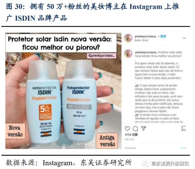 欧洲传统功能性护肤品牌主要依靠口碑营销,广告投入较少,新兴品牌逐步重视KOL在社交媒体的传播。欧洲传统的功能性护肤品牌如雅漾、理肤泉等,由于成立较早、线下渠道渗透较深,多年来较少进行大面积的广告投入,主要依赖药店渠道专业的品牌形象树立以及产品口碑获得消费者的青睐。新兴的功能性护肤品牌,例如ISDIN、Byphasse等,也开始逐步重视KOL合作以及社媒平台传播,与知名博主开展合作。