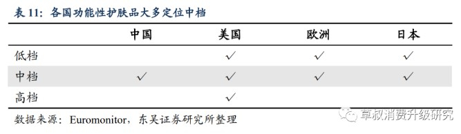 各国功能性护肤品大多定位中档。综合主要国家看,功能性护肤品大多定位于中档,高于普通大众定位的综合型护肤品,但低于高端护肤品牌。具体来看,中国功能性护肤品牌大多处于中档定位,偏基础补水功能的欧洲及日本品牌大多处于中低价位,包含科技系皮肤学级护肤、婴儿皮肤学级护肤、纯净护肤等多种类型的美国品牌则覆盖低中高档定位。